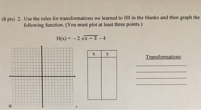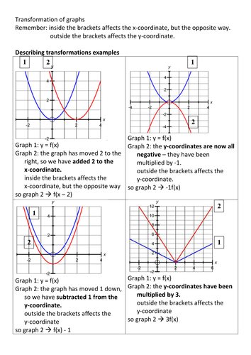 Graph transformation blitz from www.teachitmaths.co.uk What is the order of transformations in graphs? If you'renot familiar with interval notation, then please check the prerequisite chapter. The first line is thedefinition statement and should be used to determine the rest of the answers. See full list on people.richland.edu Not only did you understand it, but you wereable to do it without graphing it on the calculator. Understanding these translations will allow us to quickly recognize andsketch a new function without having to resort to plotting points. If you were to memorize every piece ofmathematics presented to you without making the connection to other parts, you will 1) becomefrustrated at math and 2) not really understand math. See full list on people.richland.edu
